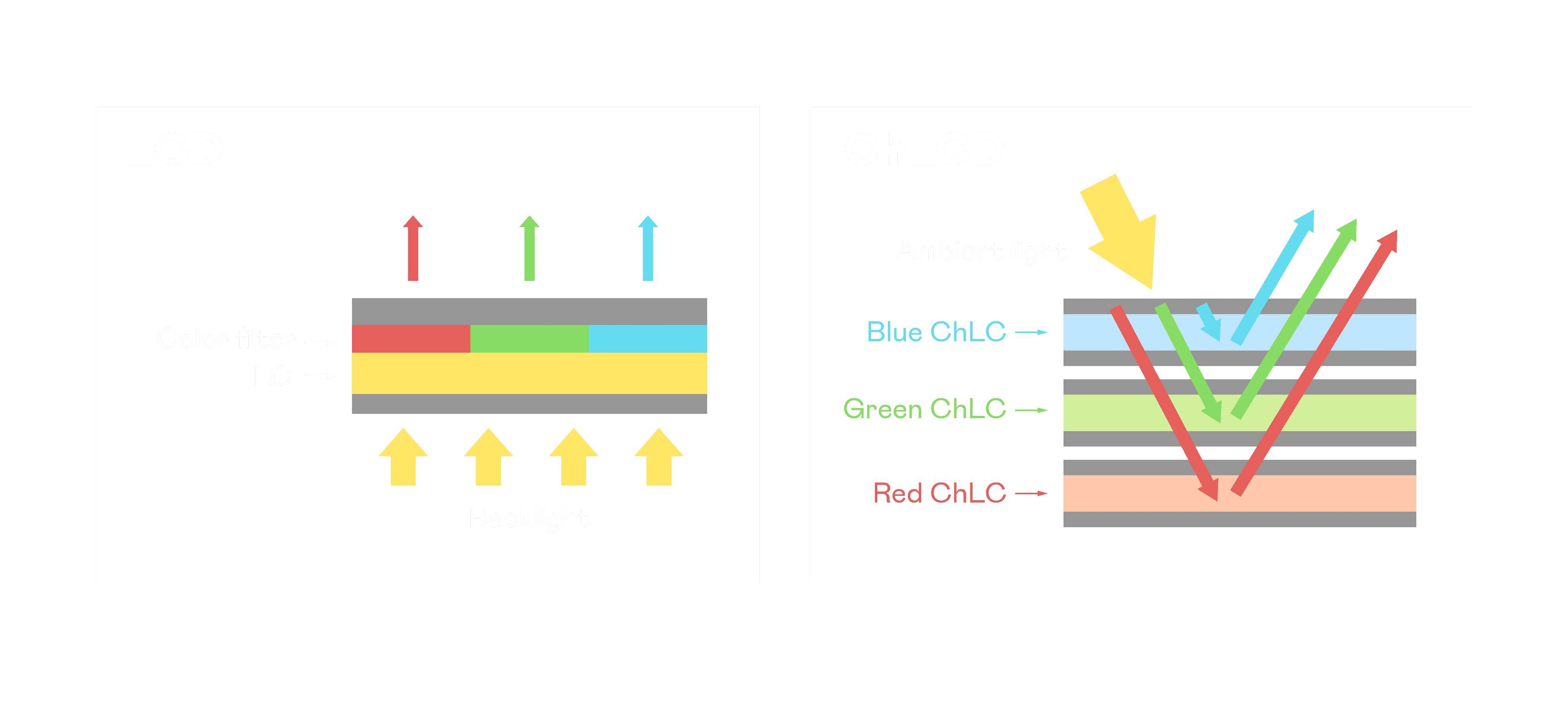 ChLCD 胆固醇液晶就如同纸张一样,,透过反射环境光来显示影像,,因此长时间观看不易造成人眼视觉疲劳,,可达到护眼效果。。。当处于户外阳光下使用,,,LCD 影像容易失真而不易观看,,,,但胆固醇液晶仍可维持较佳的影像品质。。
